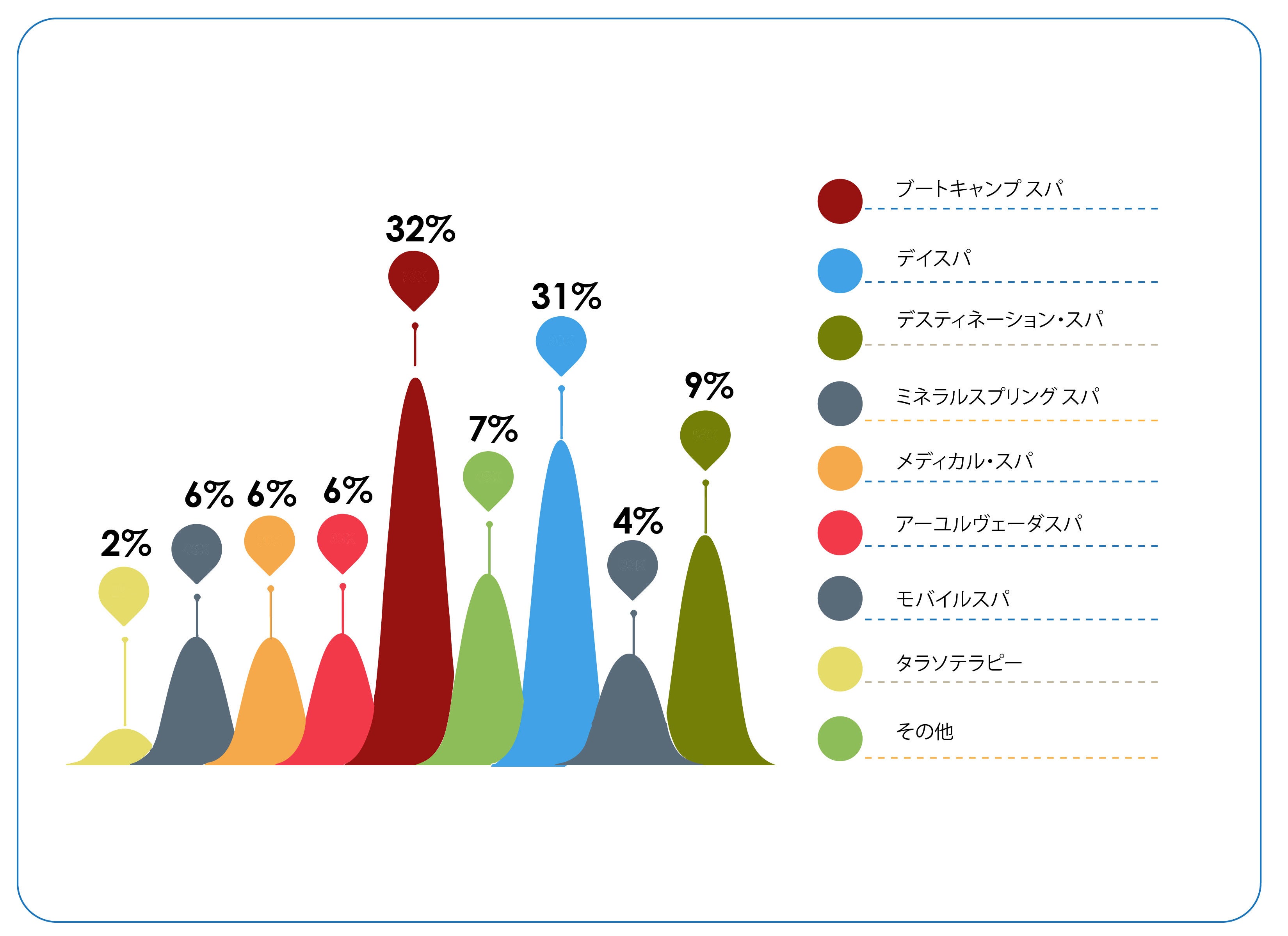 ブートランプ・スパはスパは32%の最高のシェアを持っています。 デスティネーションスパは、サービス、スペシャリスト、F&B、アクティビティなど、社内の魅力が高く、たとえばゴルフコースを計画しているリゾートよりも柔軟性があります。一部の目的地のスパでは、フィットネスクラス、健康的な料理、教育クラス、セミナーのほか、ビューティーサロンやデイスパと同様のサービスを含む包括的なプログラムを提供しています。