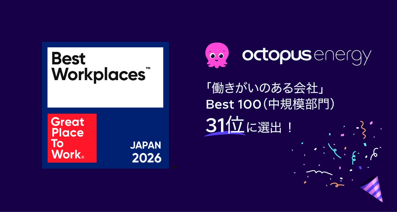 2022年から1137%の成長を遂げ、電力会社上位40社の中で成長率第1位を記録した[1]オクトパスエナジーは、テクノロジーの力でより環境価値の高いエネルギーを魅力的な価格と斬新なサービスで提供しています。このたび、Great Place To Work® Instituteの日本法人であるGreat Place To Work® Institute Japan(以下「GPTWジャパン」)が発表する2026年版「働きがいのある会社」ランキングにおいて、Best 100(中規模部門/100〜999人)31位に選出されました。