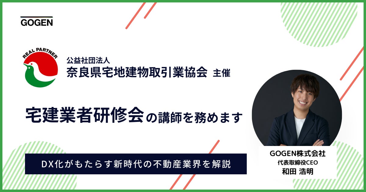 不動産売買支援ハブ「レリーズプラットフォーム」の開発・提供をするGOGEN株式会社(本社:東京都港区)の代表取締役CEO:和田 浩明が、2025年2月21日(金)に開催される公益社団法人 奈良県宅地建物取引業協会・公益社団法人 全国宅地建物取引業保証協会奈良本部主催の宅建業者研修会の講師を務めます。