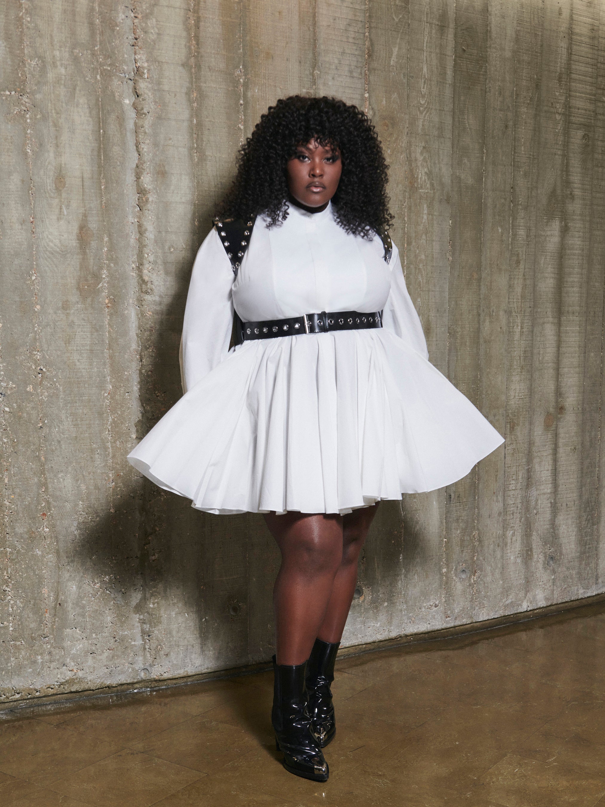 パリにて、Yseultが2022年秋冬コレクションよりカットアウェイ、ケープバックのディテールが特徴的なブラックレザーのバイカードレス、パンクチェルシーブーツを着用。