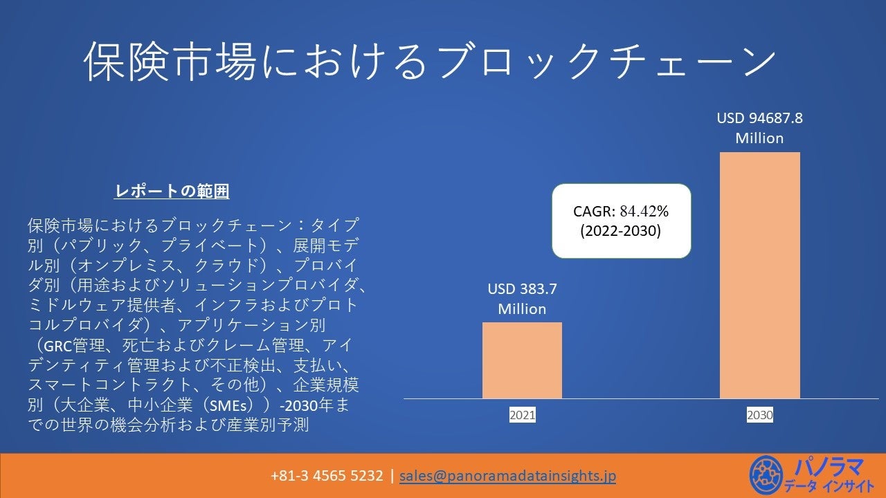 保険におけるブロックチェーンの世界市場規模は2021年に383. 7百万米ドル、2030年には94687.8百万米ドルに達すると予測され、2022年から2030年までの予測期間において年平均成長率(CAGR)は84.42%で成長すると予測されています.