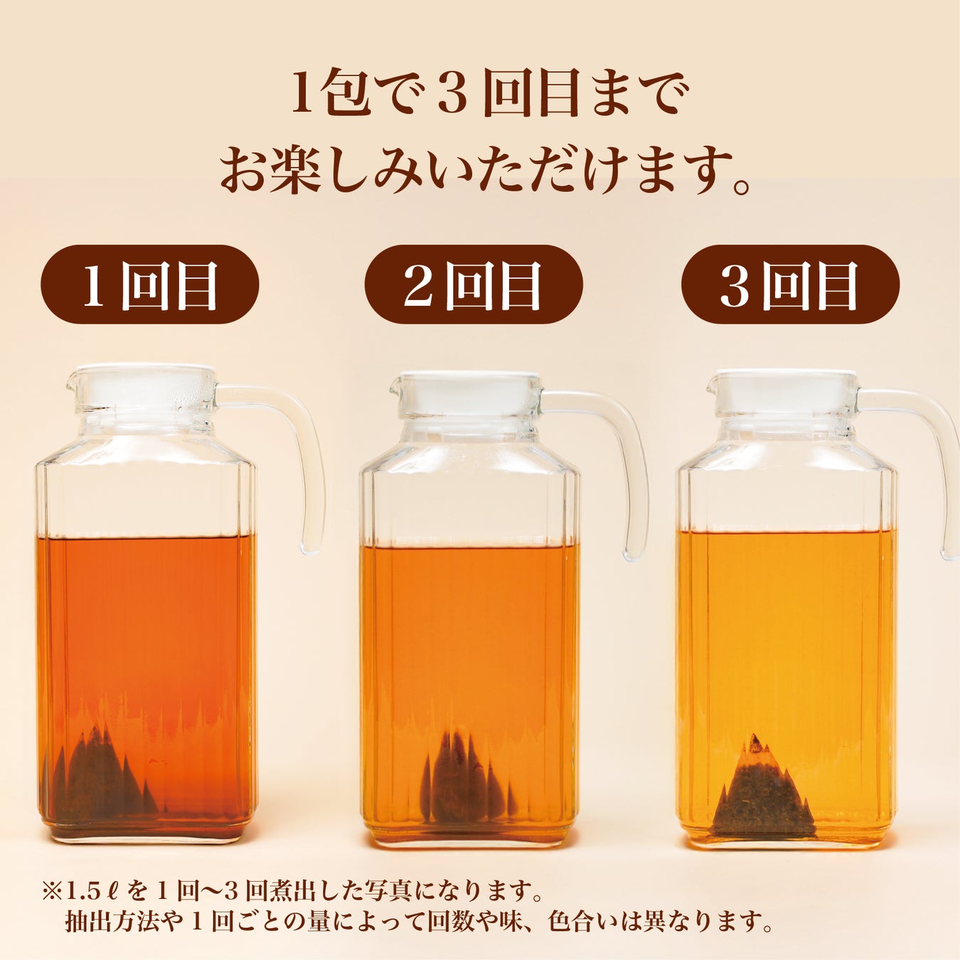 1つ1つが大きめサイズのため、1包で3回ほど色濃く抽出されたお茶を楽しめます。捨てずに繰り返し淹れて、最後は煮出しまで。1包で野草のやさしい香りと深い味わいを存分に堪能できます。