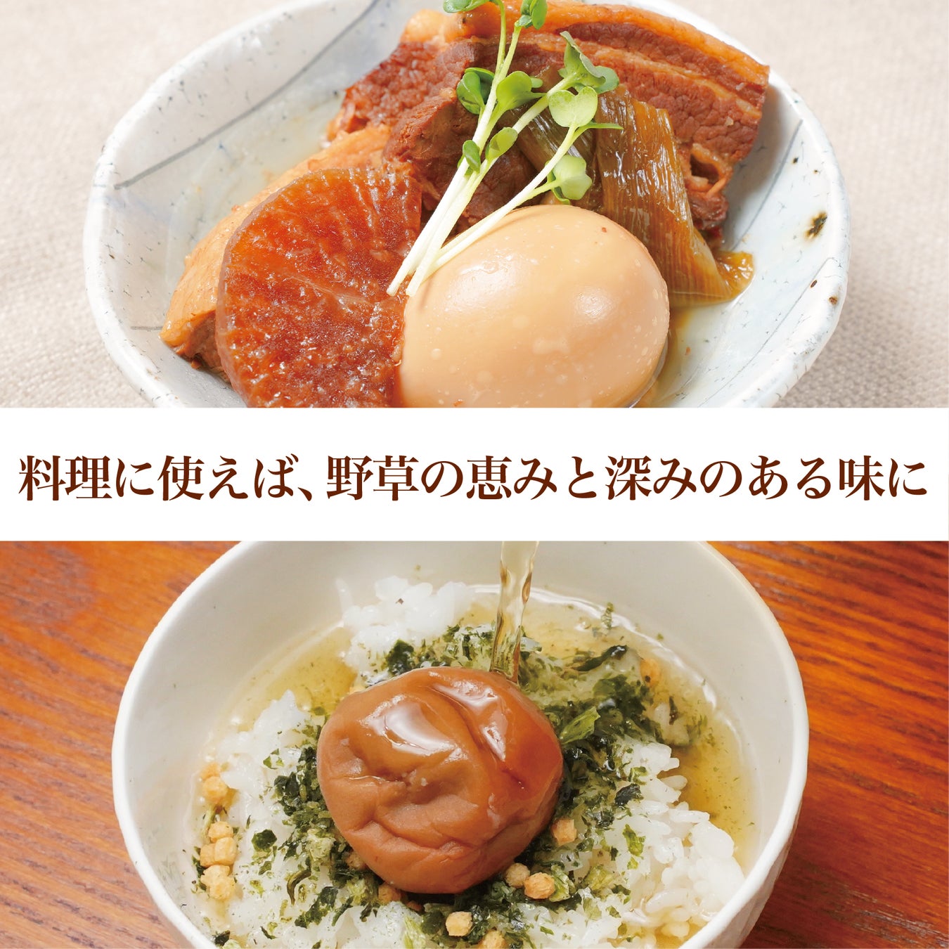 また、料理に取り入れると奥深い仕上がりに。炊き込みごはんや豚の角煮、手羽煮、お茶漬けなど、水の代わりに永養茶をお使いいただけます。日々の料理に野草のやさしい恵みを簡単に取り入れられるのが永養茶の魅力です。