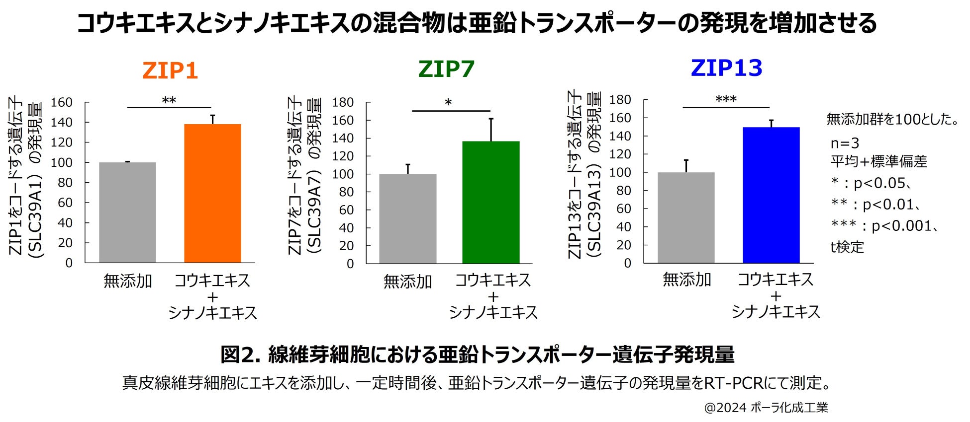 ポーラ・オルビスグループの研究・開発・生産を担うポーラ化成工業株式会社(本社:神奈川県横浜市、社長:片桐崇行)は、コウキエキス(※1)とシナノキエキスの混合物に真皮線維芽細胞の亜鉛トランスポーターの遺伝子発現量を増加させる作用を発見しました。