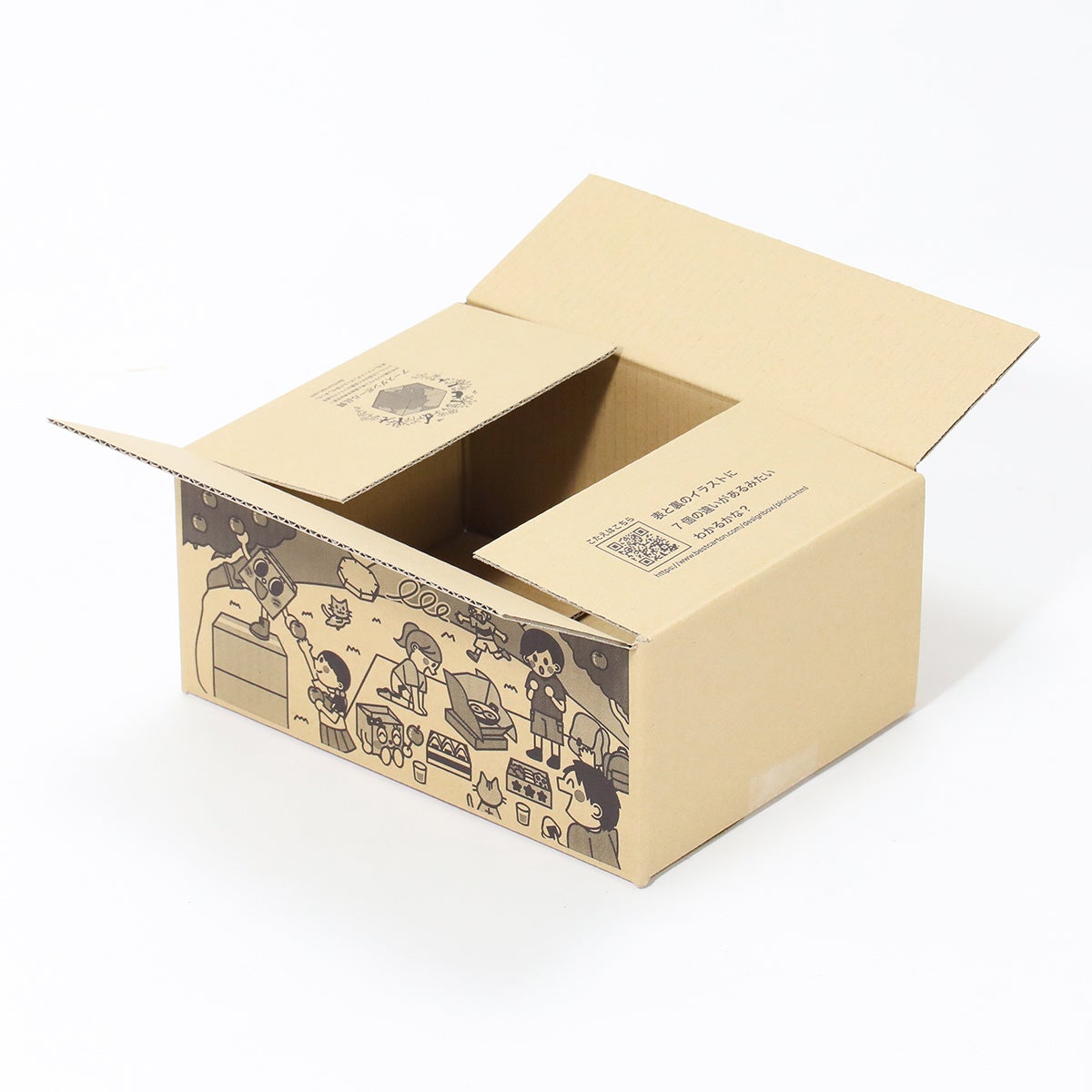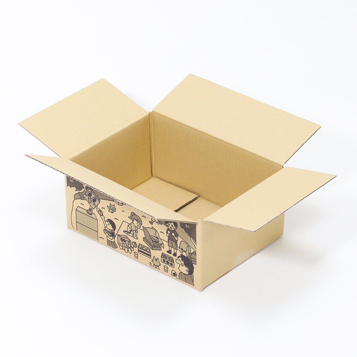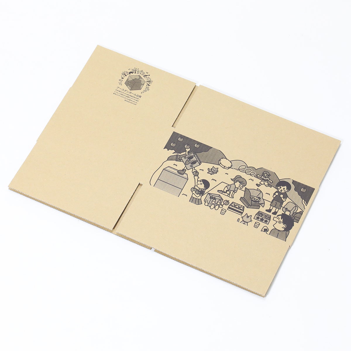 正面と背面で絵柄の違いが7個ある、間違い探し付きのデザインダンボール箱。これまでの梱包資材とは"どこか"違う、ユニークで楽しいアイデアの梱包資材です。