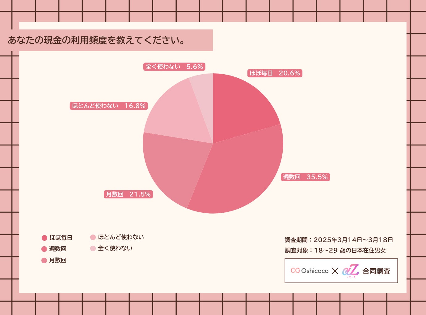 日常的に現金を使用しているとはいえ、使用頻度でみていくと、最も多い回答が「週数回の使用」の35.5%、3人に1人の割合という結果に。