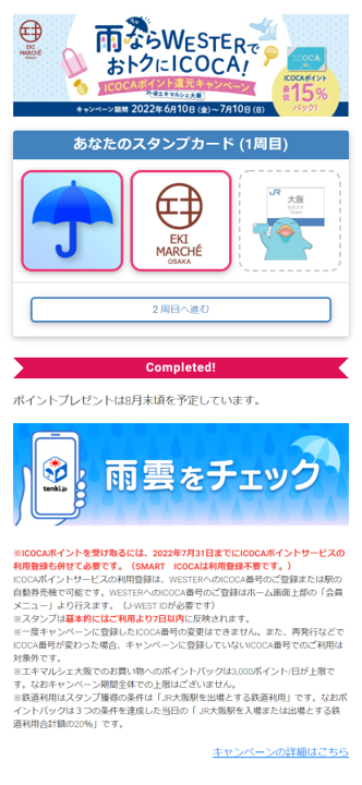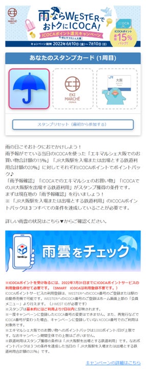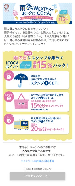 『雨ならWESTERでおトクにICOCA!~ポイント還元キャンペーン@エキマルシェ大阪~』
