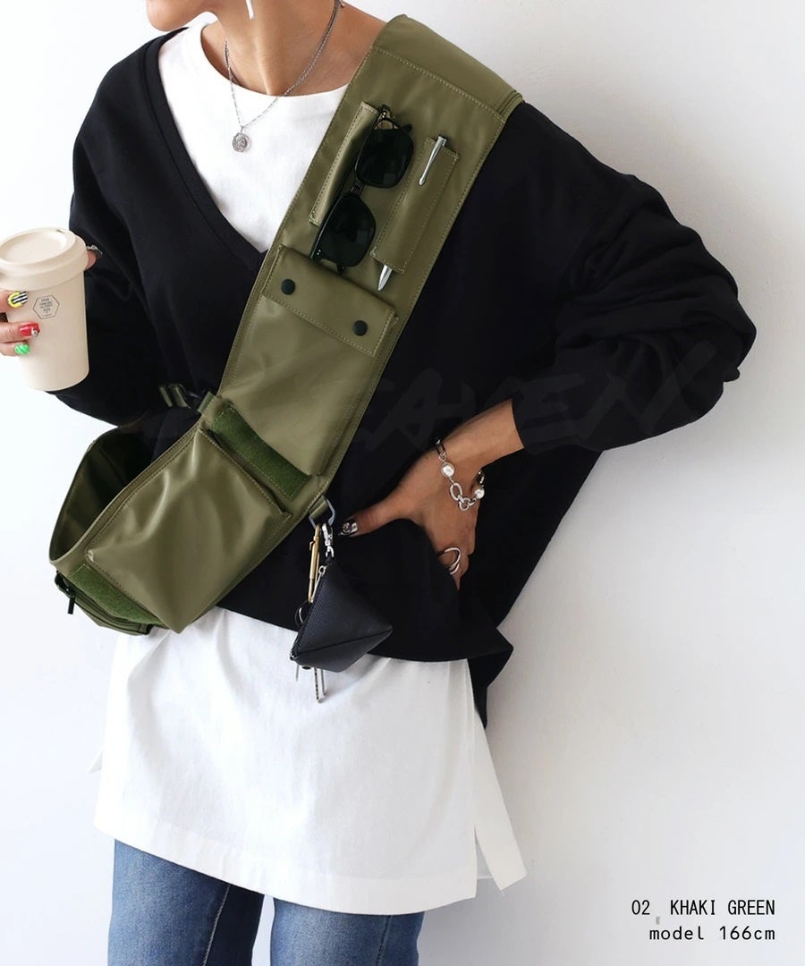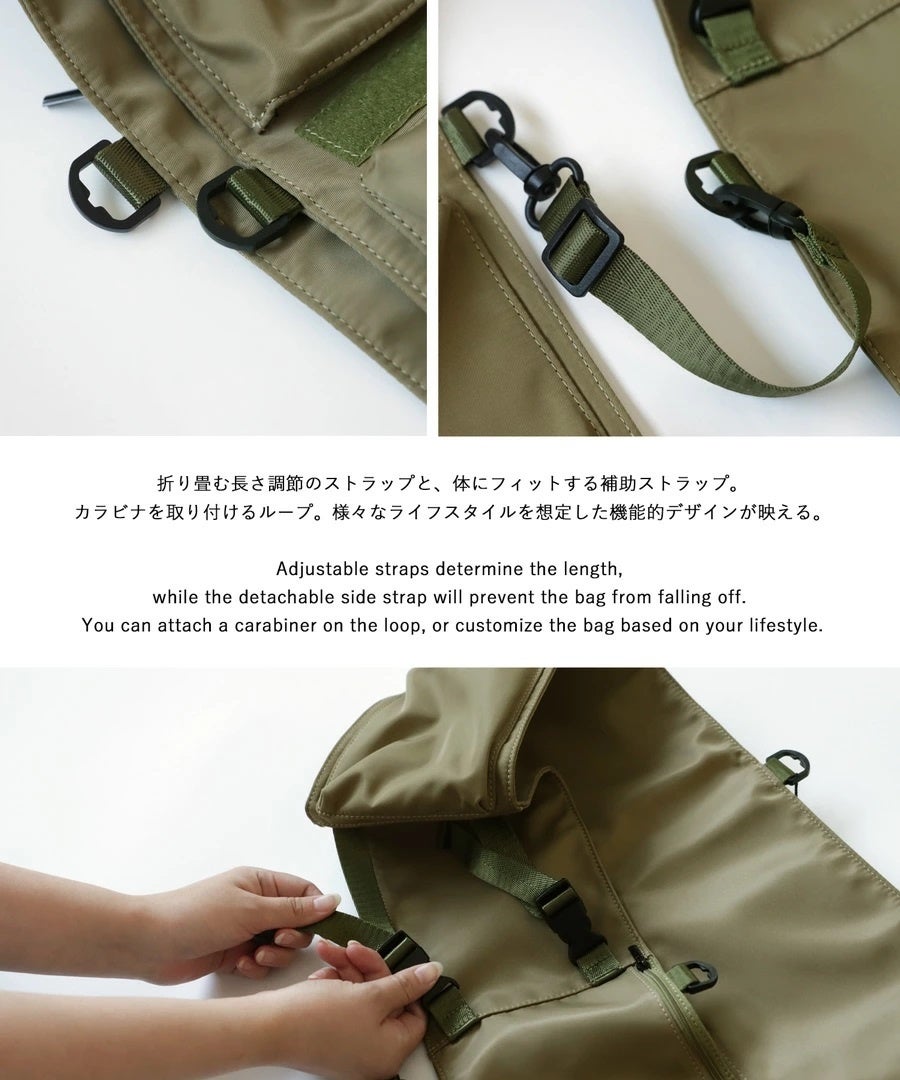 ・バッグが肩から落ちないように補強してくれる脇ストラップ付。