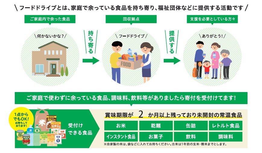 今回の取組みは、家庭で食べきれないものを「食品ロス」にしないために、石川県が今年度から開始した「家庭の食品ロス削減サポート事業」に平和堂が参加して協力するものです。各エリアのフードバンク団体や社会福祉協議会が、平和堂の店頭でフードドライブを実施し、皆様からご提供いただく食品は、食品を必要としておられる方々のためにご活用いただきます。