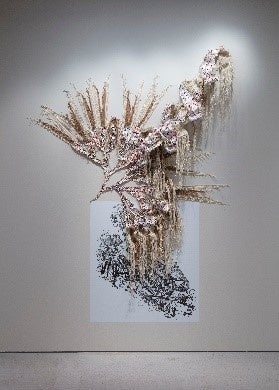 タンパク質は、「タンパク質フォールディング(折り畳み)」と呼ばれるプロセスによって、安定的に存在可能な三次元構造に自発的に折り畳まれます。2018年、AIの機械学習を利用して、タンパク質の形状をアミノ酸の配列情報から高精度で予測できるソフトウェアAlphaFoldが発表され、バイオ・インフォマティクスの分野で大きな注目を集めました。自己組織化するプロセスやパターンを絵画やドローイングを通して表現してきた村山は、自身の「織物絵画」シリーズとタンパク質フォールディングのあいだに構造発展過程の観点から類似性を見出し、2020年に《Painting Folding》と題した作品シリーズを発表しました。本展ではこれをさらに発展させ、村山の織物絵画の三次元情報からアミノ酸配列を算出し、その情報を再度AlphaFoldに予測計算させて、人間の手による織物絵画からミクロな自然に存在し得るタンパク質構造を新しくデザインすることを試みます。