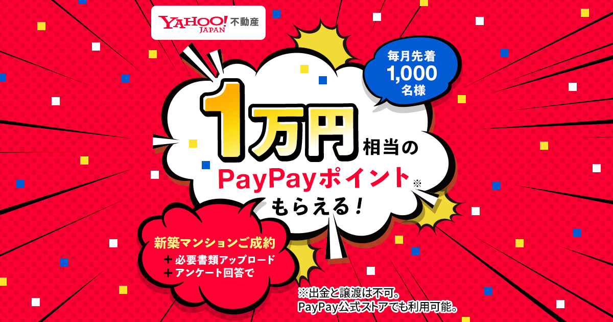 対象物件に、「Yahoo!不動産」上において資料請求または見学予約(※2)をし、成約(売買契約)した上で(※3)、必要書類アップロードおよびアンケートに回答したユーザーに、1万円相当のPayPayポイントが進呈されます。