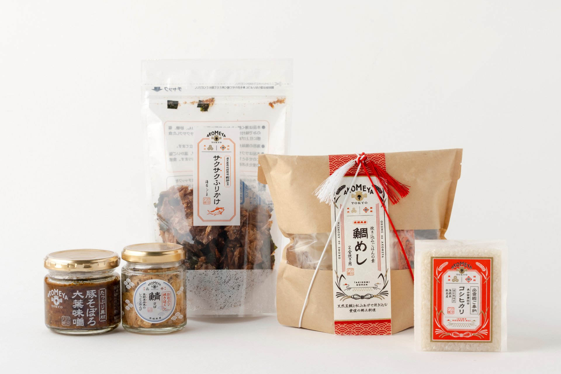 AKOMEYA TOKYOのシグニチャー商品として長年愛されているお米「島根県飯南町 コシヒカリ」、渦潮育ちの自慢の鯛を贅沢に使った人気No.1の「炊き込みごはんの素 鯛めし」をはじめ、ごはんのお供の食べ比べも愉しめるアコメヤの売れ筋商品をひとまとめにしたスペシャルセット!
