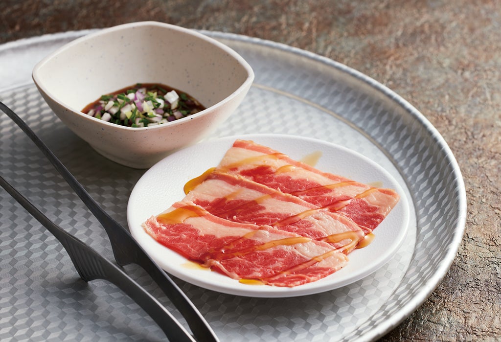 明洞のドラム缶焼肉をイメージしたオリジナルの香味野菜ダレにつけてお召し上がりいただく一品。キレのあるタレと、赤身と脂身のバランスが