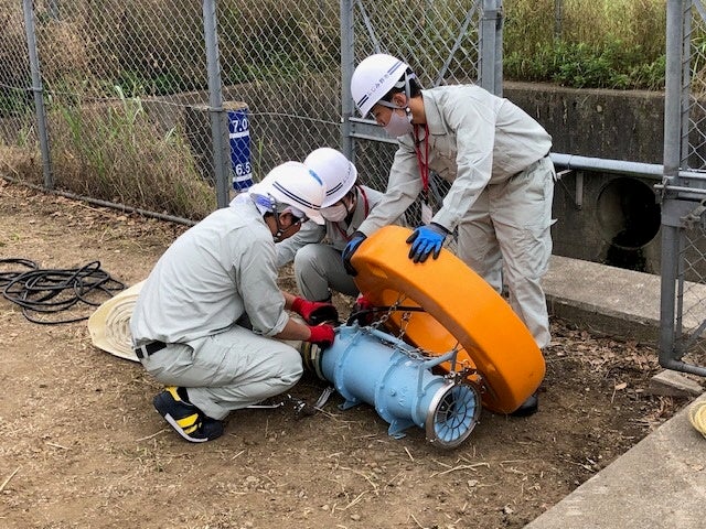 排水ポンプを迅速かつ正確に設置して排水作業を行うためには、日頃から、実践を想定した訓練が不可欠であり、毎年、福岡江川と川越江川において、実働訓練を行っています。今年も、排水ポンプやエンジンポンプの操作方法の手順確認など実働訓練を実施します。