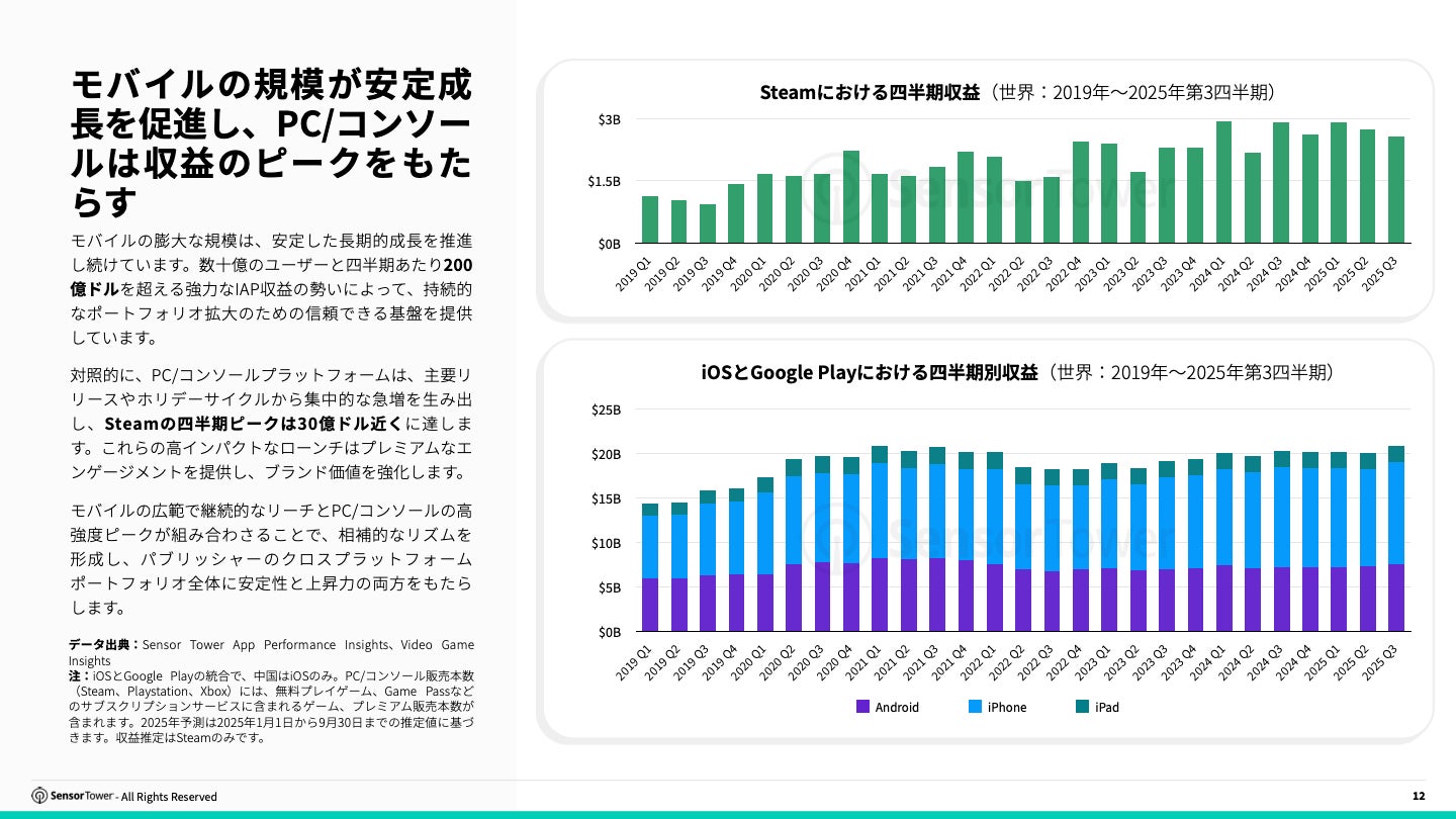 モバイルの広範で継続的なリーチとPC/コンソールの高強度ピークが組み合わさることで、相補的なリズムを形成し、パブリッシャーのクロスプラットフォームポートフォリオ全体に安定性と上昇力の両方をもたらします。
