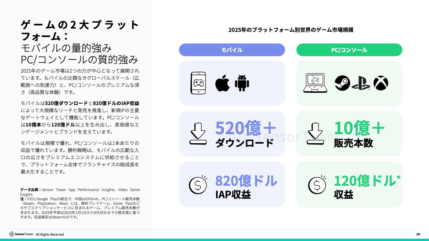 モバイルは520億ダウンロードと820億ドルのIAP収益によって大規模なリーチと発見を推進し、新規IPの主要なゲートウェイとして機能しています。PC/コンソールは10億本から120億ドル以上を生み出し、高価値なエンゲージメントとブランドを支えています。