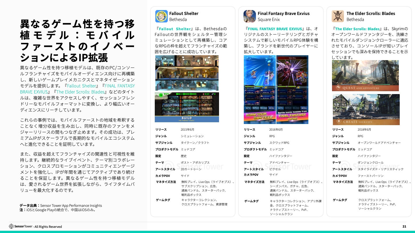 異なるゲーム性を持つ移植モデルは、既存のPC/コンソールフランチャイズをモバイルオーディエンス向けに再構築し、新しいゲームプレイメカニクスとマネタイゼーションモデルを提供します。『Fallout Shelter』『FINAL FANTASY BRAVE EXVIUS』『The Elder Scrolls: Blades』などのタイトルは、複雑な世界をアクセスしやすく、セッションフレンドリーなモバイルフォーマットに変換し、より幅広いオーディエンスにリーチしています。
