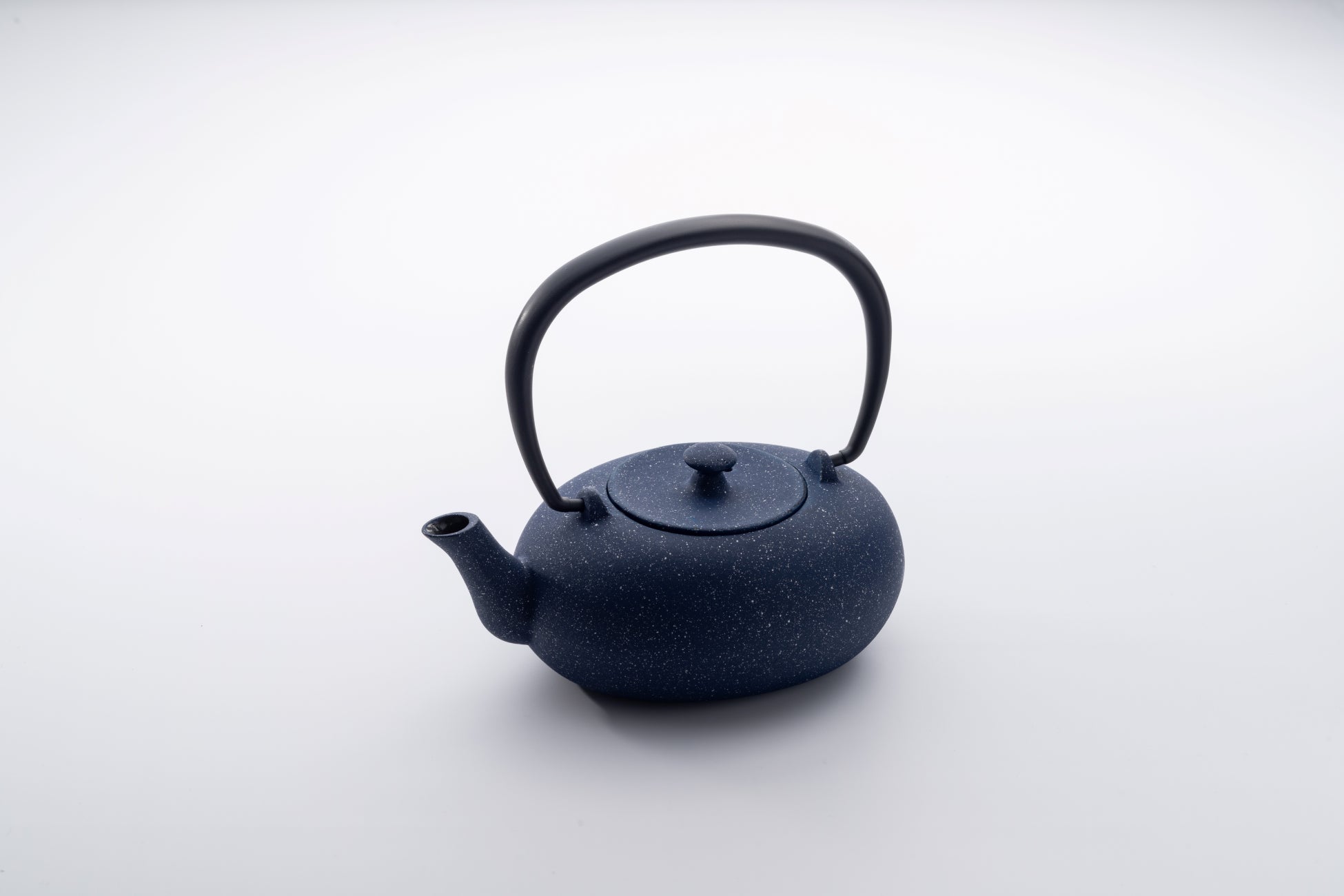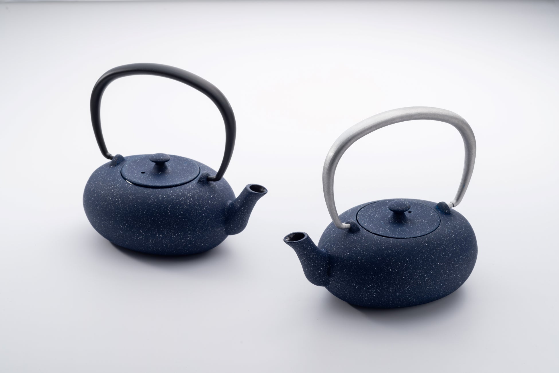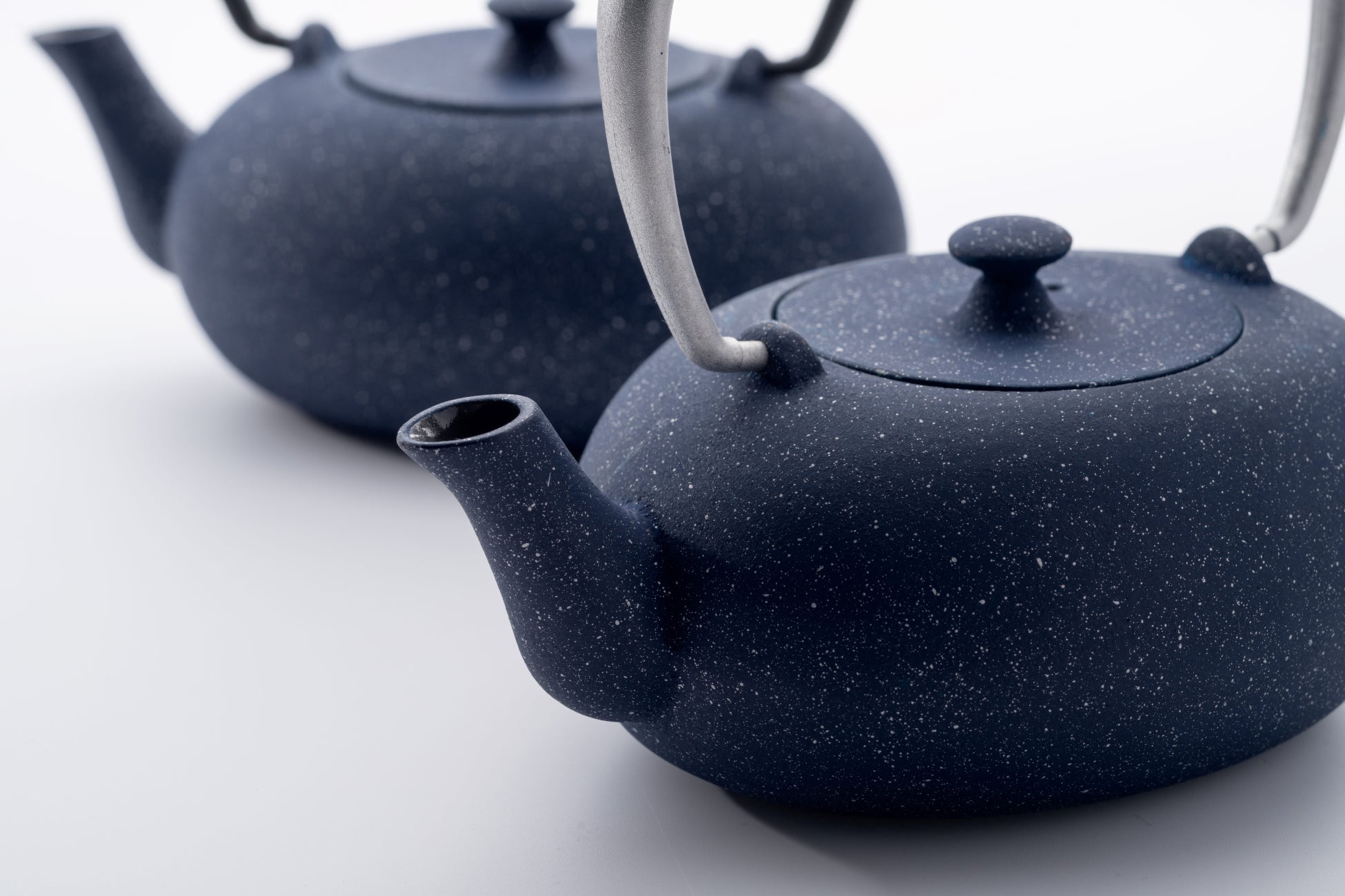 従来と異なる素材のため、鋳造ノウハウをまとめあげることに苦労しましたが、世界で初めて自動車鋳物部品の鉄廃材を再利用した急須・冷酒器を創りあげることができました。形状は天空に舞うひらぐもです。日本を象徴する色として外国からも「ジャパンブルー」と評される藍色を用いました。ミッドナイトブルーにも見紛う深みのある色に星を散りばめ、夜空をイメージできると思います。また形は、雪に覆われた山形の霊峰月山です。新時代へ向けての「新伝統と創造」です。日本茶の急須として、紅茶、中国茶などの茶器としてはもちろん、コーヒードリップ用のポットとして、さらに、燗瓶や冷酒などの酒器としてもご利用いただけます。