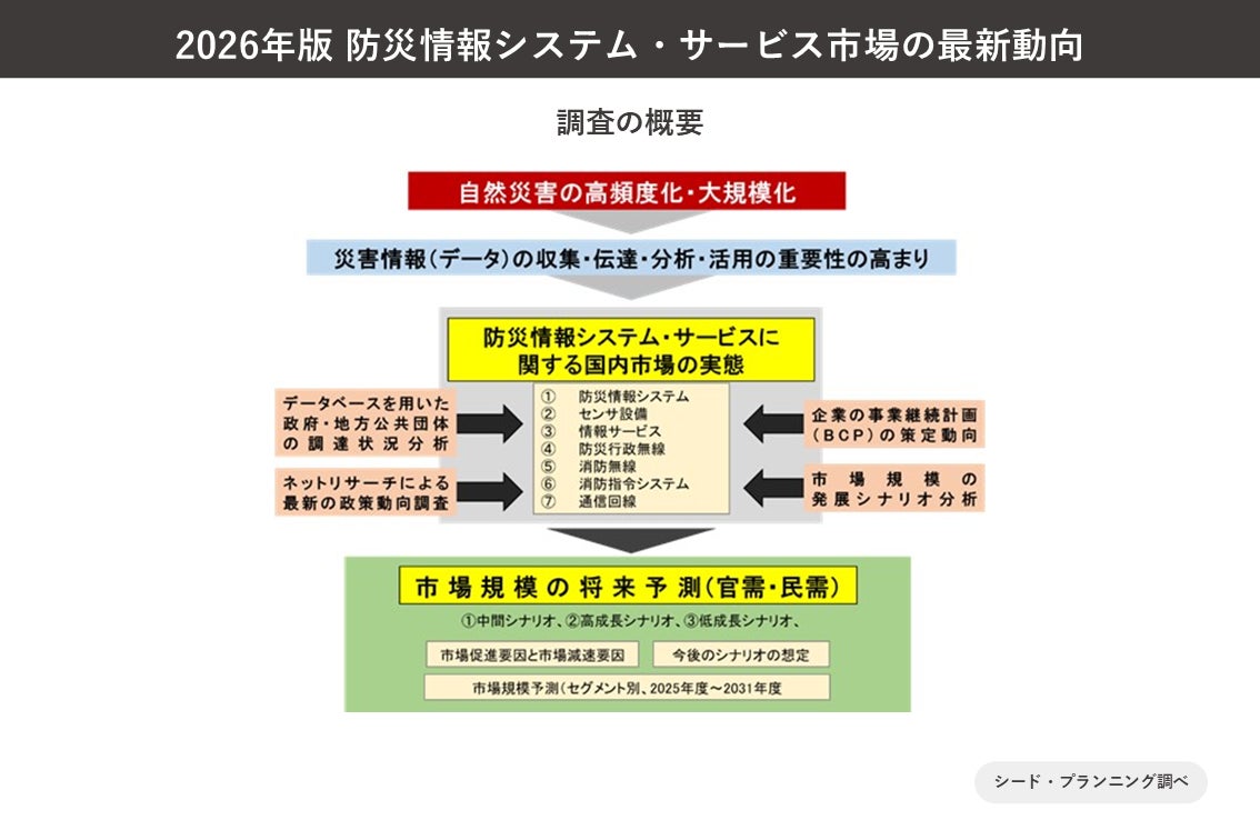 株式会社シード・プランニング(本社:東京都文京区 梅田佳夫社長、以下シード・プランニング)は、国内の防災情報システム・サービス市場について、官公庁による調達状況、最新の政策動向、主要プレイヤー(40社)のサービス動向・技術トレンド等を詳細に調査し、その結果を公開したことをお知らせいたします。