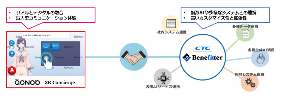 今回の協業では、コノキューのAIアバターソリューション「NTT XR Concierge」(以下、NTT XR コンシェルジュ)とCTCの対話型AI Hubプラットフォーム「Benefitter」(ベネフィッター)を連携させた、AIアバターとの対話による新たな接客システムの開発を行います。