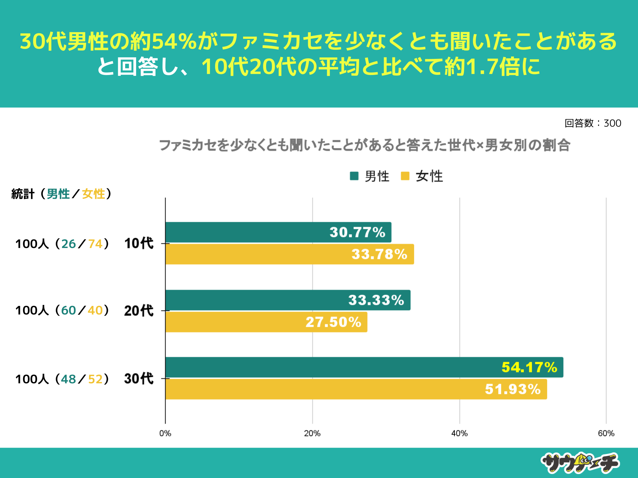 【30代男性の約54%がファミカセを少なくとも聞いたことがあると回答し、10代20代の平均と比べて約1.7倍に】