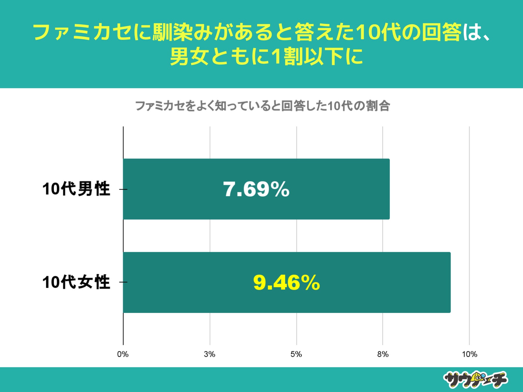 ファミカセに馴染みがあると答えた10代の回答をみてみますと、10代男性が約8%、10代女性が約9%で、10代の男女ともに1割を下回る結果となりました。