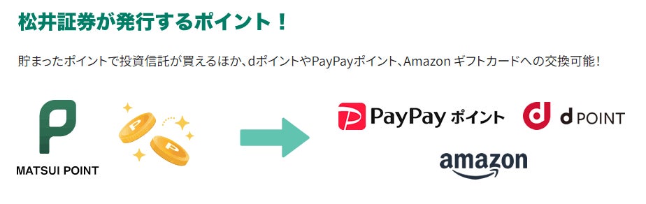 なお、本サービスで付与されるポイントは松井証券ポイントとなり、特定の投資信託の購入をはじめ、dポイントやPayPayポイント、Amazonギフト券との交換が可能です。