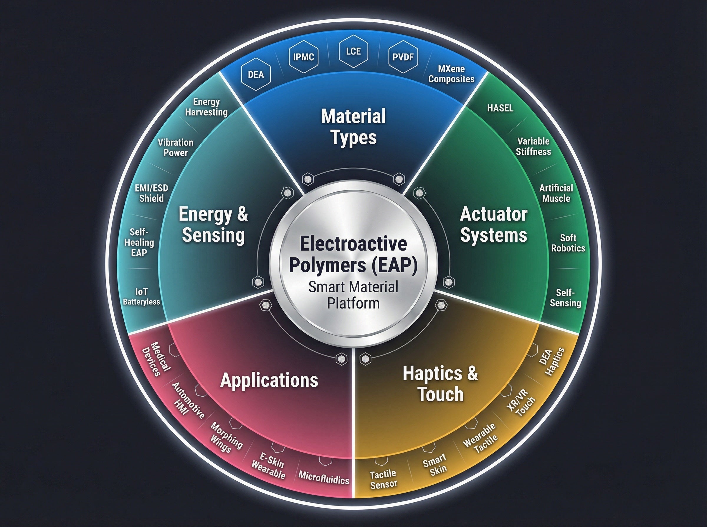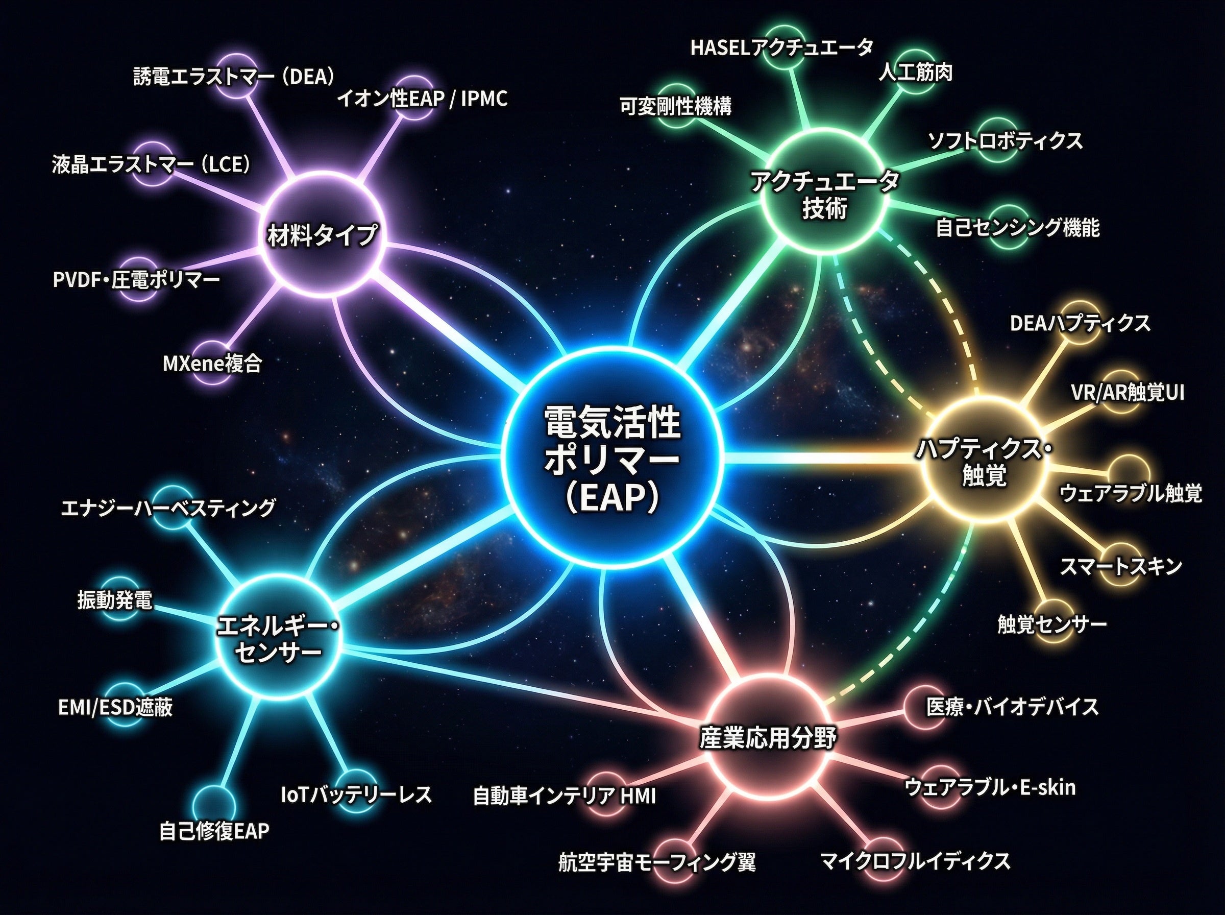 電気活性ポリマー・可変剛性技術・触覚(ハプティクス)の3軸が交差するスマート材料を中核に、ソフトロボティクス・人工筋肉・ハプティクス・ウェアラブル・バイオメディカルデバイスという五大応用領域を網羅解析
