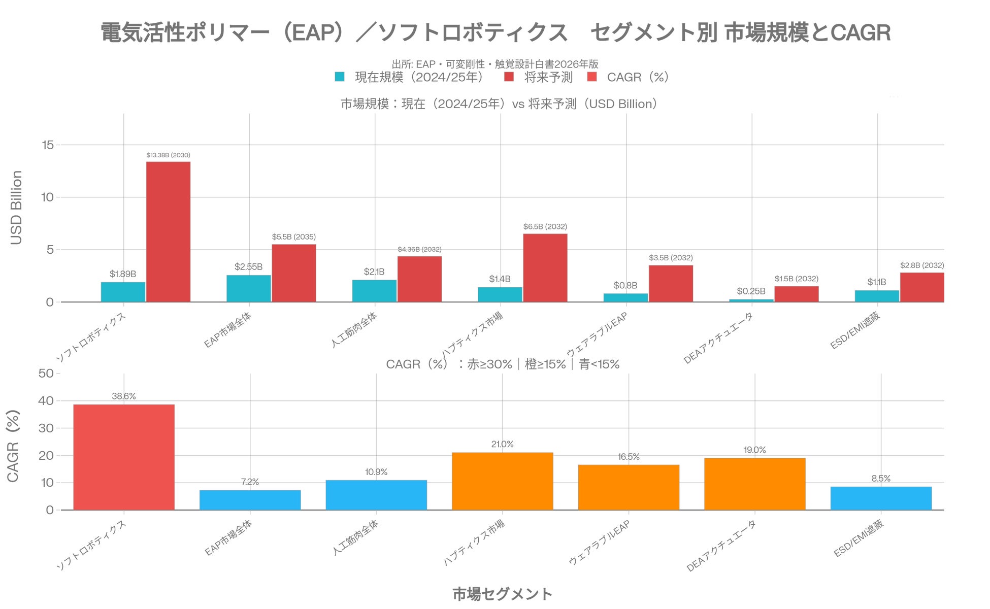 EAP市場は2024年時点で約25.5億米ドルと推計され、2035年にかけてCAGR約7.2%で55億米ドルへの成長が見込まれる。なかでもソフトロボティクス市場はCAGR約18〜39%という突出した高成長を示し、人工筋肉市場はCAGR 10.9%で2032年に43.6億米ドルへの拡大が予測されている。
