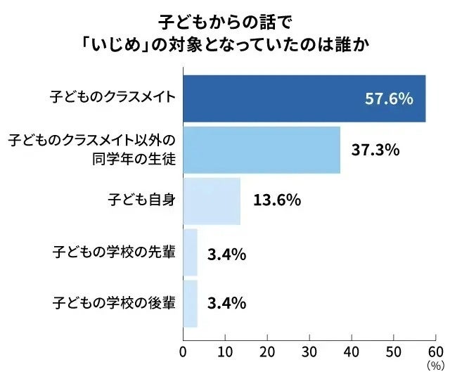 さらに注目すべき点は、いじめの対象が“我が子本人”だったと回答した家庭が13.6%存在したことです。これは、いじめが特別な家庭だけの話ではない、どの家庭にも起こりうる身近な課題であることを示唆しています。