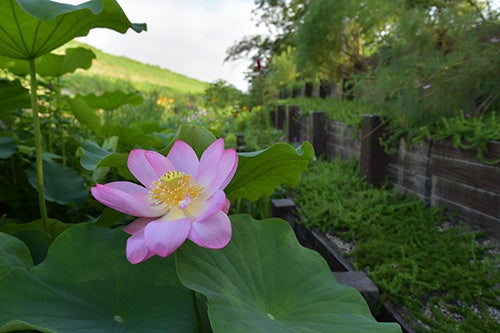 高槻市南庄所町を流れる新川の桜堤付近で、ハスの花が今年も開花し、散策に訪れた人の目を楽しませています。