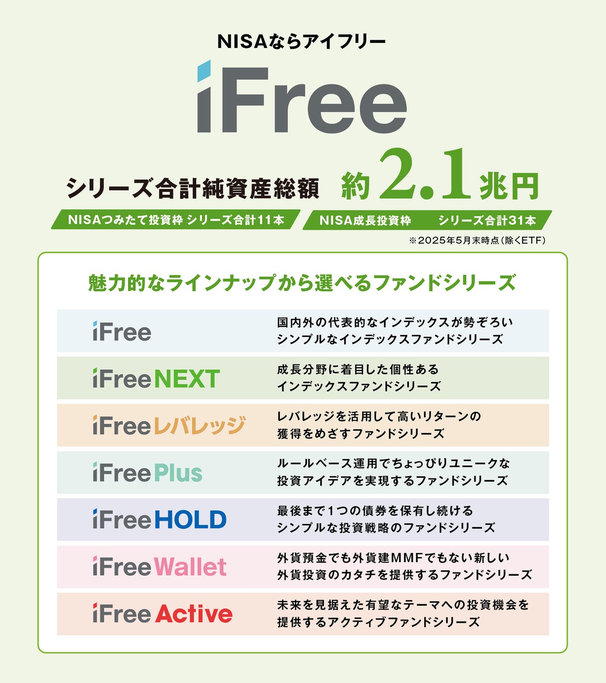 iFreeは「投資をもっと自由に」をコンセプトに2016年9月に低コストインデックスファンドシリーズとして誕生しました。多くのお客さまにご愛顧いただき、シリーズ合計純資産総額は約2.1兆円、合計ファンド数は31本となりました(2025年5月30日現在、除くETF) 。