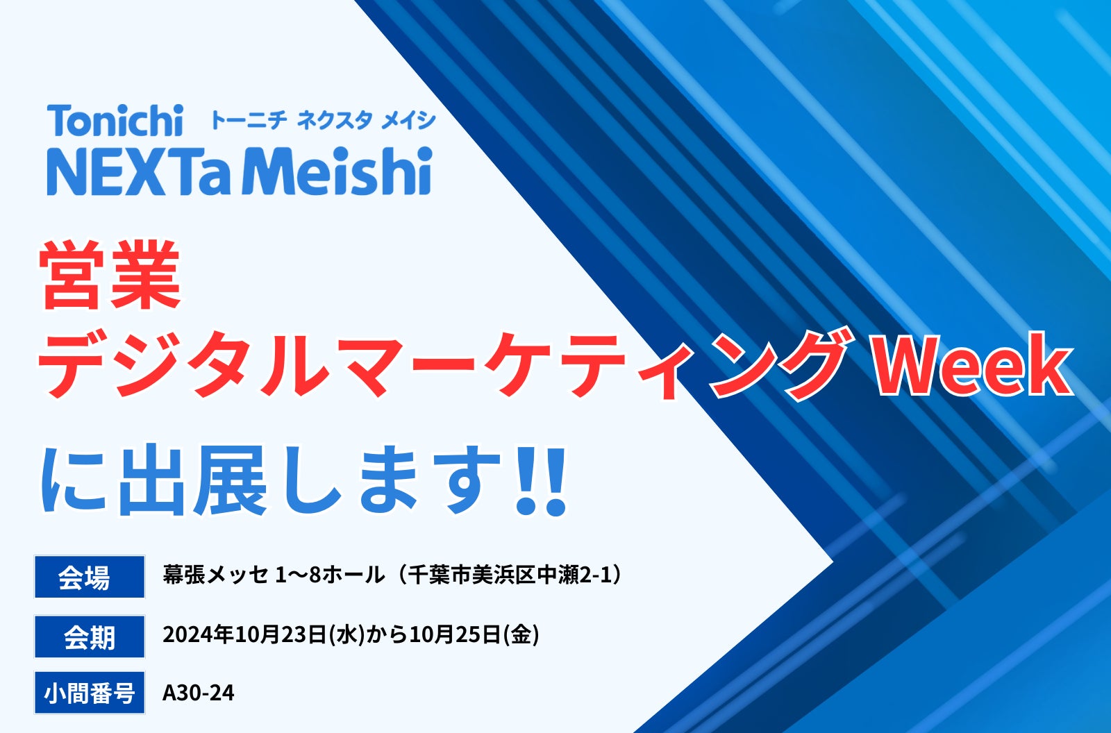 法人向け名刺管理アプリ「ネクスタ・メイシ(https://tnexta.com/)」を開発・販売する東日印刷株式会社(本社:東京都江東区、社長:西川光昭、以下TONICHI)は、10月23日(水)~25日(金)に幕張メッセで開催される「営業・デジタルマーケティング Week 秋」に出展します。