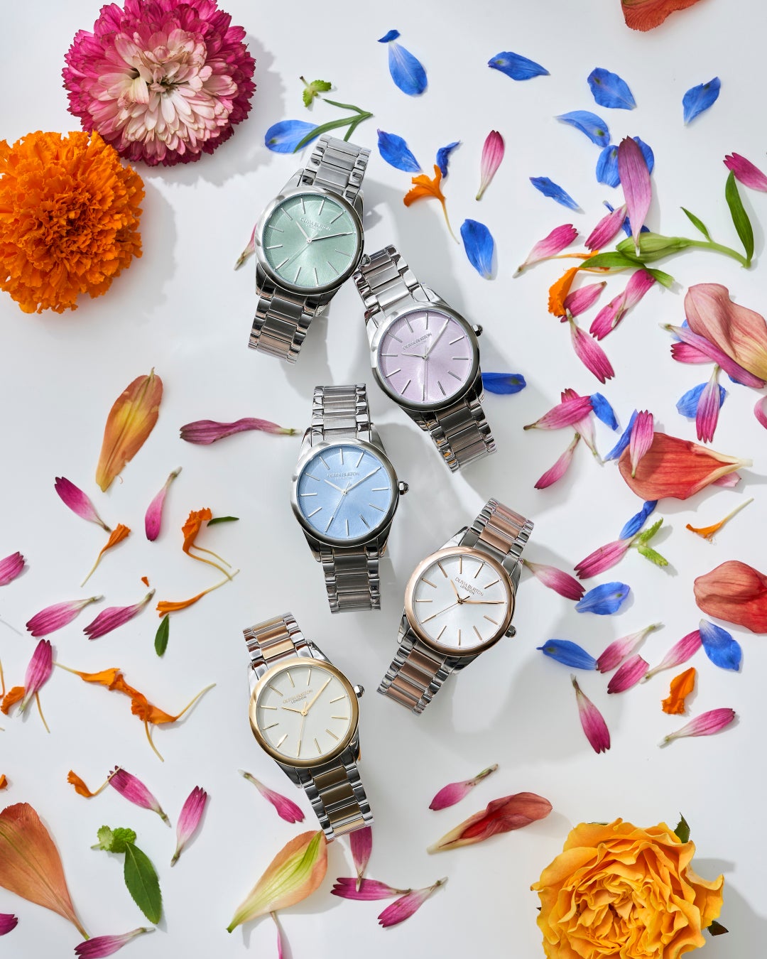 オリビア・バートンの新作ウォッチコレクションは、マッチャグリーン、スカイブルー、ピンククラッシュなど、スイーツから着想を得たキャンディカラーで彩られます。ロリポップのようなスワールテクスチャーが特徴のサンレイダイヤルは、見た目にも楽しく、動きと光を感じさせるポップな仕上がりに。ミニマルなインデックスと洗練されたスリムケース、そしてクラシックな3リンクブレスレットの組み合わせで、カラーが主役のスタイリングを楽しめます。アイコニックな「ハニカムクラウン」やスターインデックスのテクスチャーなど、ディテールにもこだわりを。デイリーからちょっとしたお出かけまで、気分を高める全6モデルが登場します。