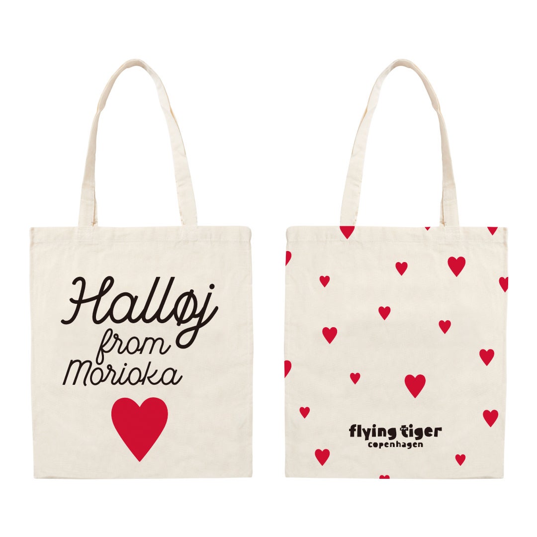Flying Tiger Copenhagenでは、各店限定の『ストアリミテッドバッグ』を販売しています。〈イオンモール盛岡南ストア〉では、デンマークの人たちが大好きなモチーフ”ハート”と、メッセージ“Halløj from Morioka” (デンマーク語で「盛岡からこんにちは!」)を配したバッグを展開。4/25(金)のオープン日、先着100名様に、この『ストアリミテッドバッグ』をプレゼントします。