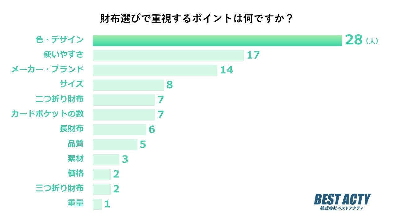 財布選びで重視するポイントについて100人にアンケートを行ったところ、「色・デザイン」と回答する人が最も多い結果となりました。