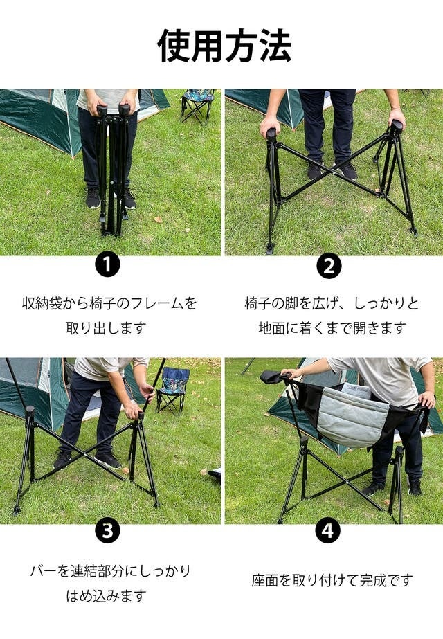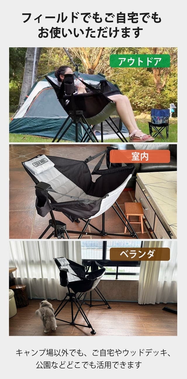 キャンプ—山間、湖畔、または草地でチェアを広げれば、すぐにプライベートなリラックス空間ができます。風の音を聞いたり、星を見たり…心も身体も開放され、リラックスした時間を楽しむことができます♪
