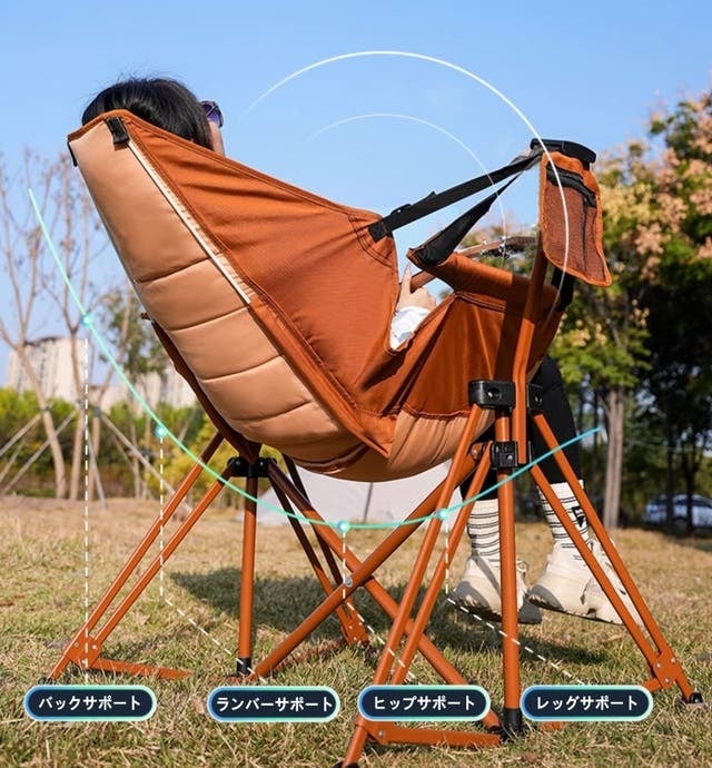アウトドアキャンプにこの『ダブルフレーム式ロッキングチェア』を持っていけば、キャンプ体験が一層楽しく快適に。座るとまるで自然に包まれるような優しいフィット感、横になれば雲の上で揺れているような極上の心地よさが広がります。どんなに動いても、ひっくり返る心配がなく、安定した快適さを保ちます。