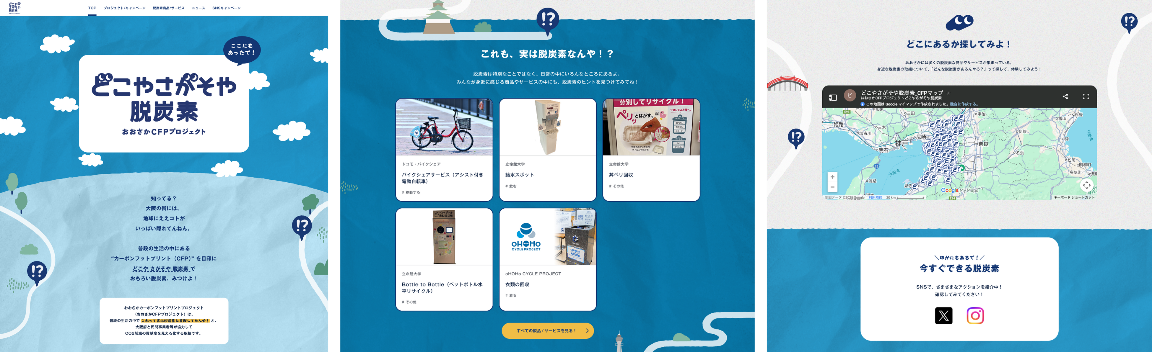 本キャンペーンの趣旨である、府民のみなさまに「こんなことも、あんなことも、脱炭素だったんだ」と日常生活における「身近な脱炭素」について驚きをもって発見・選択してもらうことをめざし、おおさかカーボンフットプリントプロジェクトで連携する事業者の脱炭素に貢献する製品やサービスをわかりやすく紹介し、どこで商品を手に取ることができるか、マップで表示しています。