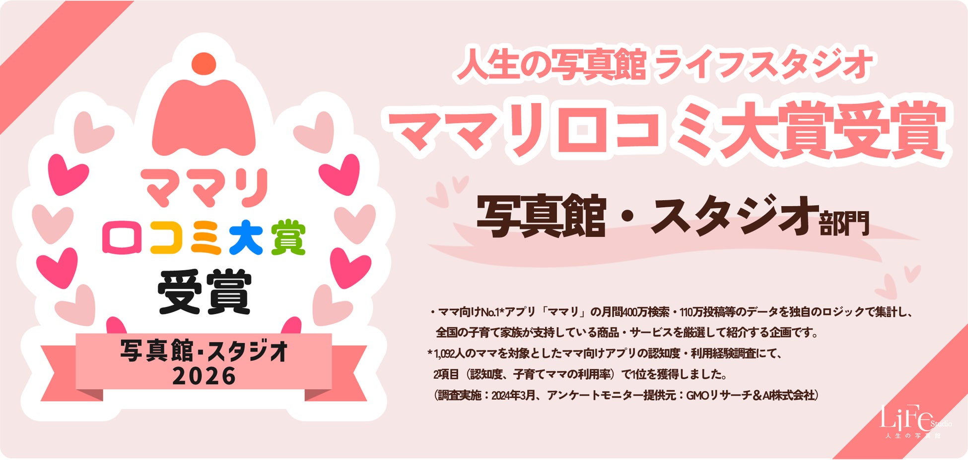 ライフスタジオは「ママリ口コミ大賞2026」の“写真館・スタジオ部門”にて受賞いたしました。ママ、パパを中心とした育児世代から圧倒的な支持を受け、多くの口コミと実績によって選出された安心と信頼の証です