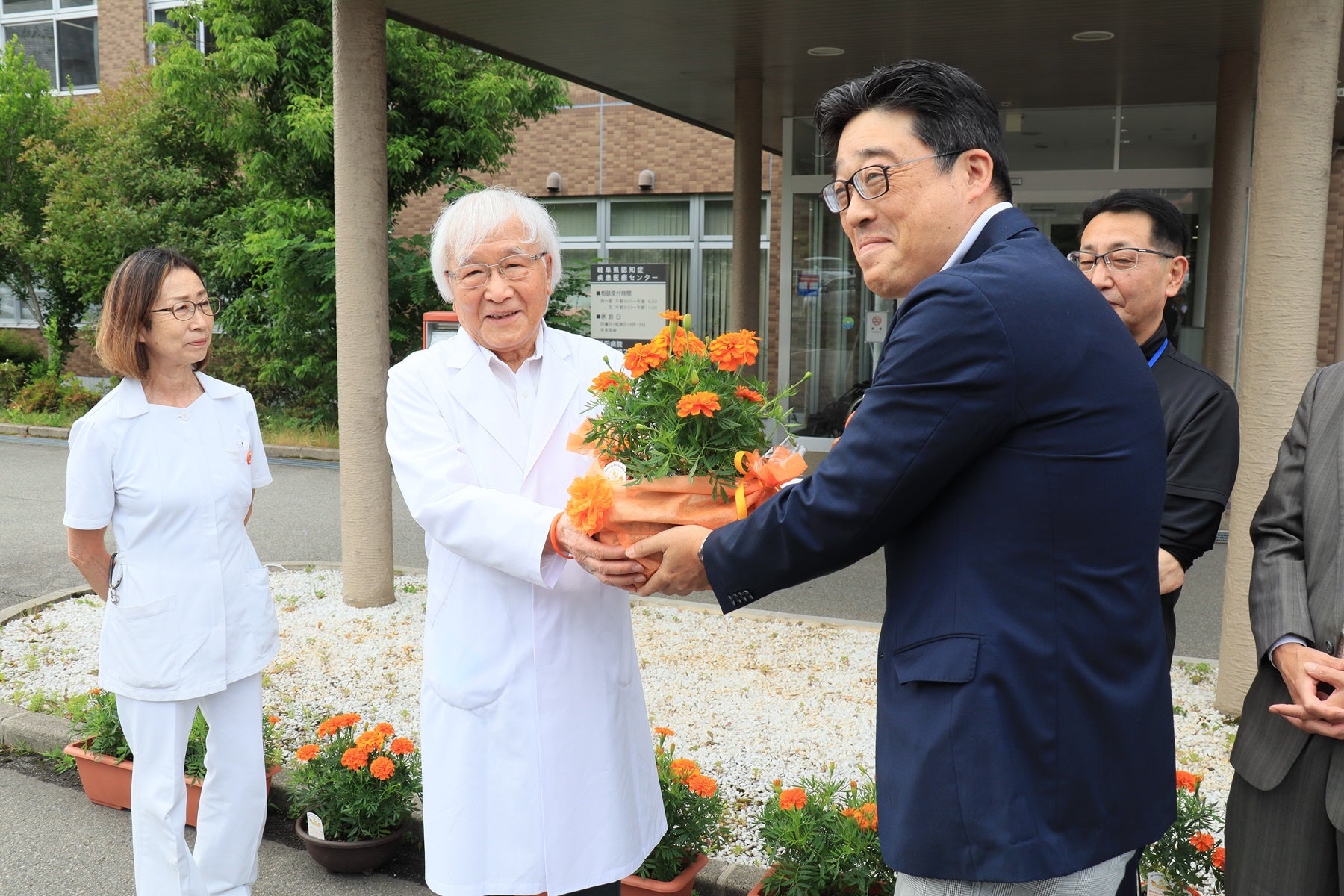 岐阜県高山市では、9月の認知症月間に認知症のシンボルカラーの花を咲かせる「オレンジガーデニングプロジェクト」を始めるにあたり、令和6年6月18日(火)に、市内にある須田病院へ花の苗や種などを贈呈しました。