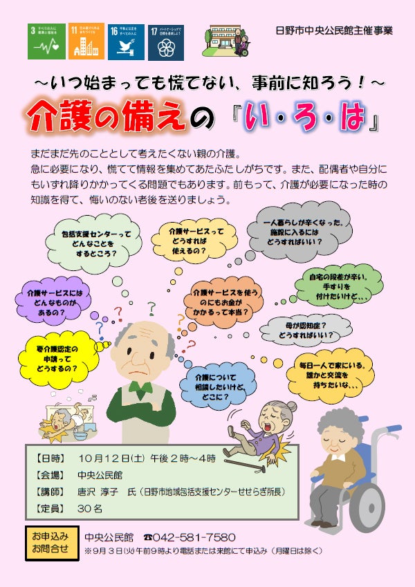 地域で暮らす高齢者の暮らしを支える「総合相談窓口」である地域包括支援センターの方に、具体的な手続きや問題点を話していただき、介護についての窓口の敷居を低くして身近に感じていただきます。