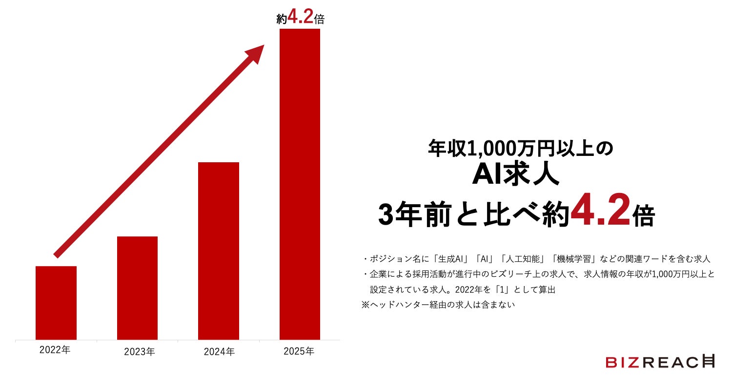 また、ビズリーチ上の「年収1,000万円以上のAI求人」も増加傾向で、3年前に比べ約4.2倍と大きく伸長しています。幅広い産業でエンジニアを中心にAIを開発・実装できる高度専門人材が求められており、2026年もその傾向は継続すると推測されます。