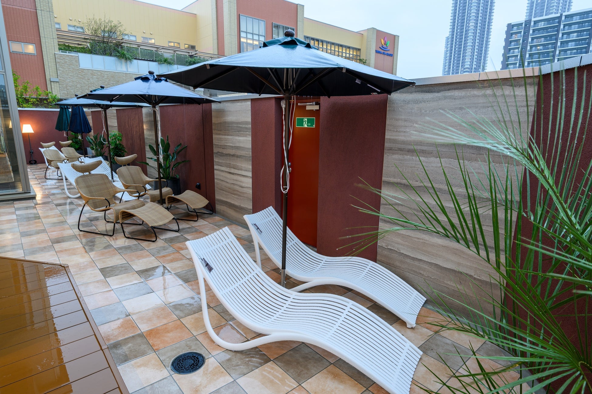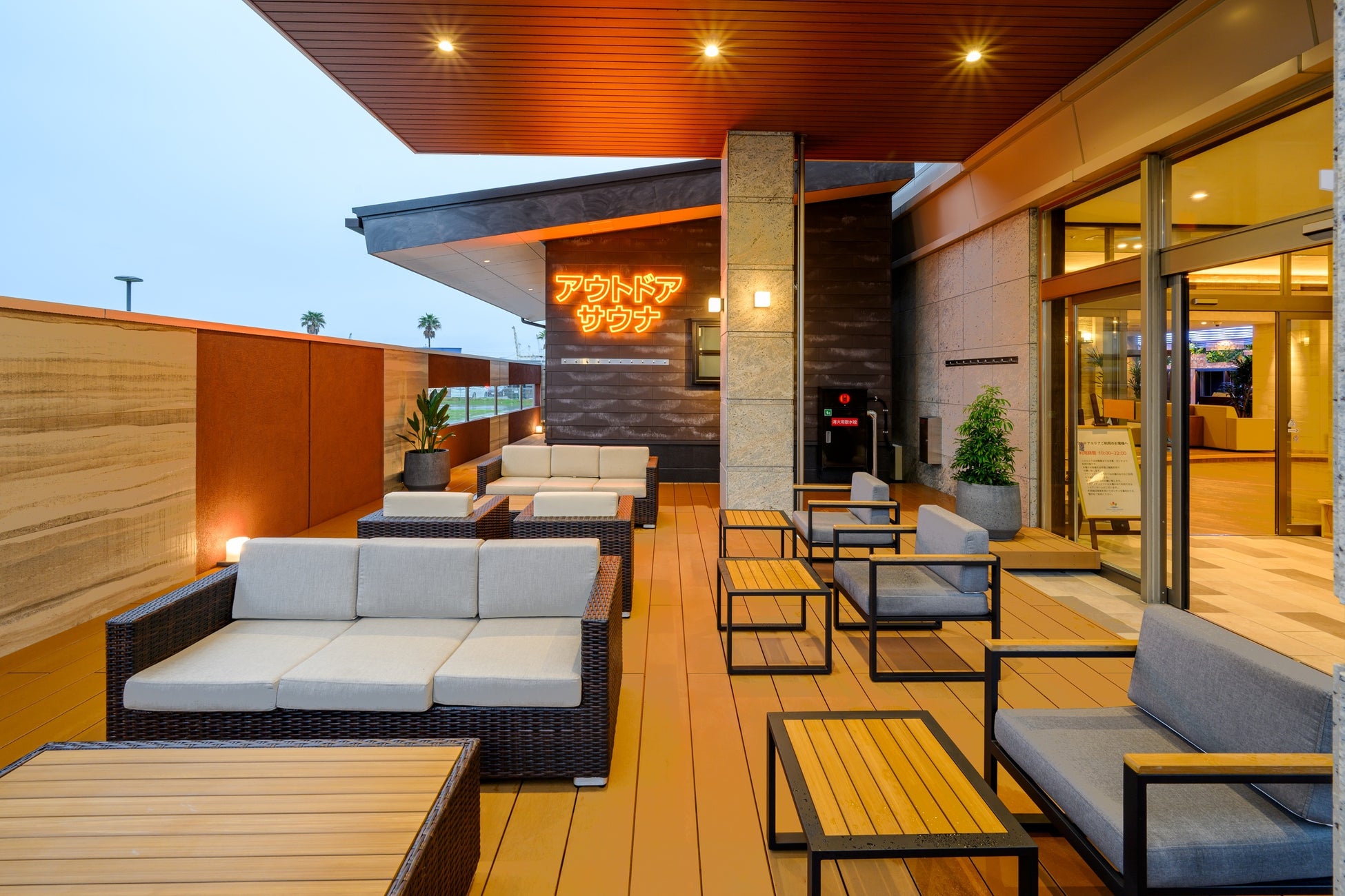 屋外に新たなアウトドアエリアを新設しました。エリア内には、男女共用で利用できるアウトドアサウナを導入し、あわせて南国風のプールサイドを思わせる開放的なテラス空間を整備しています。