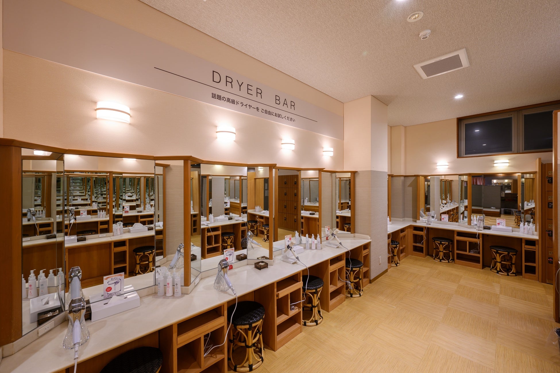 女性パウダーコーナーには、通常のドライヤーとは別に、人気ブランドの高機能モデルを無料で利用できる「ドライヤーバー」を設置しました。