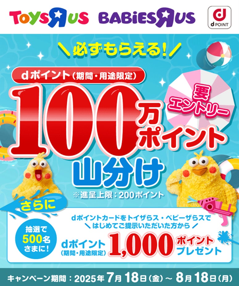 本キャンペーンへの参加にはエントリーが必要です。エントリー期間中にキャンペーンサイトからエントリーの上、トイザらス・ベビーザらスの対象店舗※1でお買物の際、 dポイントカード※2 などをご提示(1ポイント以上ためる)いただくと、dポイント(期間・用途限定)100万ポイントを山分け進呈いたします※3。さらに、期間中はじめてトイザらス・ベビーザらスでdポイントカード※2などをご提示(1ポイント以上ためる)された方の中から、抽選で500名さまにdポイント(期間・用途限定)1,000ポイントを進呈いたします。※3キャンペーン詳細はキャンペーンサイトにてご確認ください。