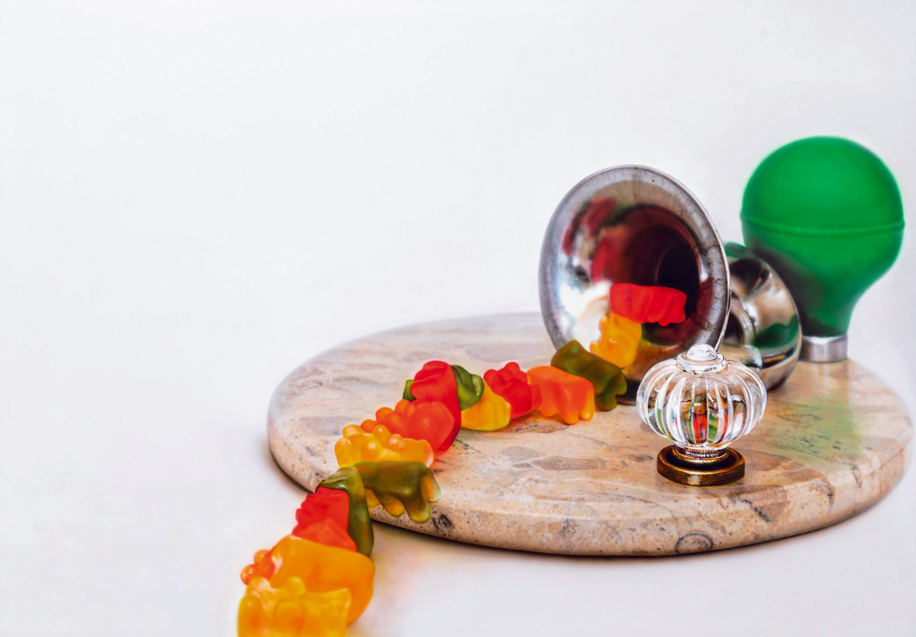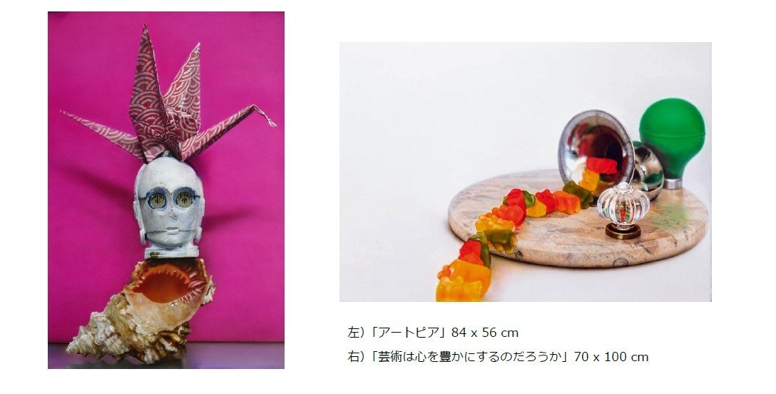 また、モチーフは身近なものでありながら、その一つひとつに象徴的な意味が込められ、見る者を深く考えさせます。ギリシャ神話シリーズ「孤独への恐れ/ミノタウロス」では、牛とゴリラのおもちゃをミノタウロス、背後の写真を美の女神ヴィーナスに見立て、美の対極の存在として描いています。貝殻は彼が閉じ込められている迷宮を囲む海、毛糸玉は勇者テセウスを導く道しるべというように、神話のエッセンスが散りばめられ、青や紫、茶色が彼の威厳と、孤独から救われる未来への希望をも感じさせます。モチーフの意味を考察する楽しさもあれば、神話の時代から現代に通じる普遍的なテーマを見つめるきっかけにもなるでしょう。