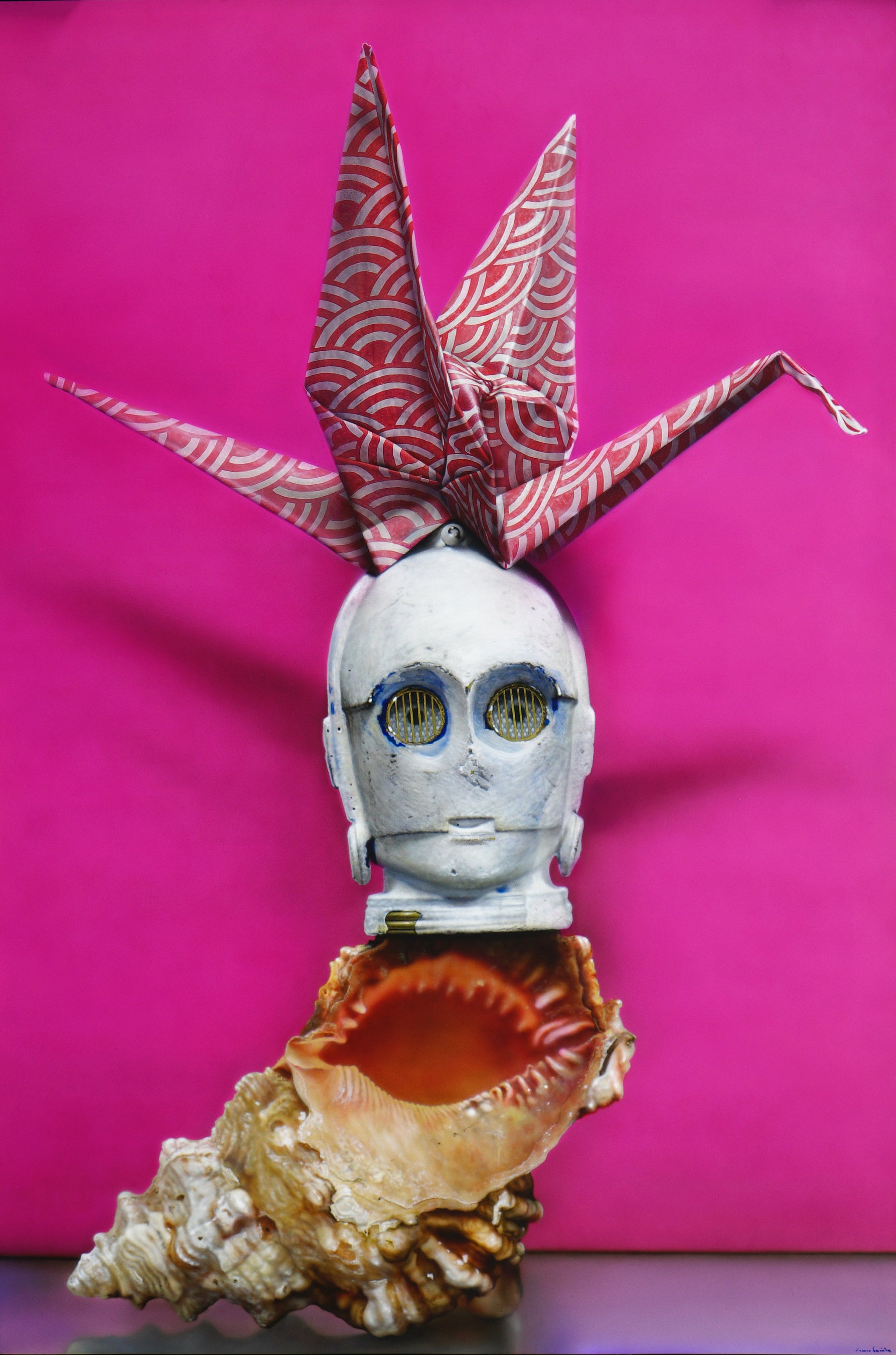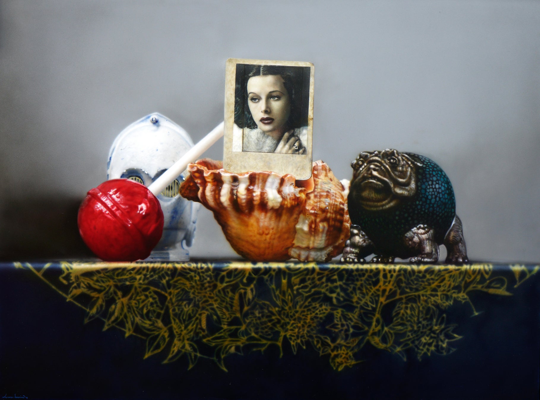 1940年代に活躍した女優ヘディ・ラマーを、貝殻から現れるヴィーナスに見立てた作品。ラマーはその美貌だけでなく、BluetoothやWi-Fiの礎となる無線誘導システムの発明者としても知られています。彼女の隣には、古くからロマネスク美術で忠誠と誠実のシンボルとされてきた犬の彫刻が並び、背後には最先端技術の象徴ともいえるロボットの頭部がこちらを見つめています。過去と未来、美・自然・テクノロジーといったテーマに迫る一作です。
