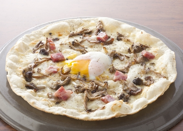 今回の秋のシーズンメニューでは、「日高豚と茄子のシシリア風」「サーモンといくらの岩海苔仕立て」などに生パスタ“リイングイネ”を使用いたしました。“リングイネ”は楕円形の切り口でソースが絡みやすく、モチモチっとした食感が特徴で、今回から新しくレシピに登場します。またマイタケ・シメジ・エリンギを使用した「きのことベーコンのカルボナーラ風」など秋のにぴったりのピザもご用意いたしております。