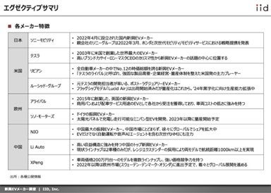 本レポートでは、新興EVメーカー各社のこれまでの歩みを振り返りながら、SWOT分析を用いて事業の現状・今後の課題などを分析している。